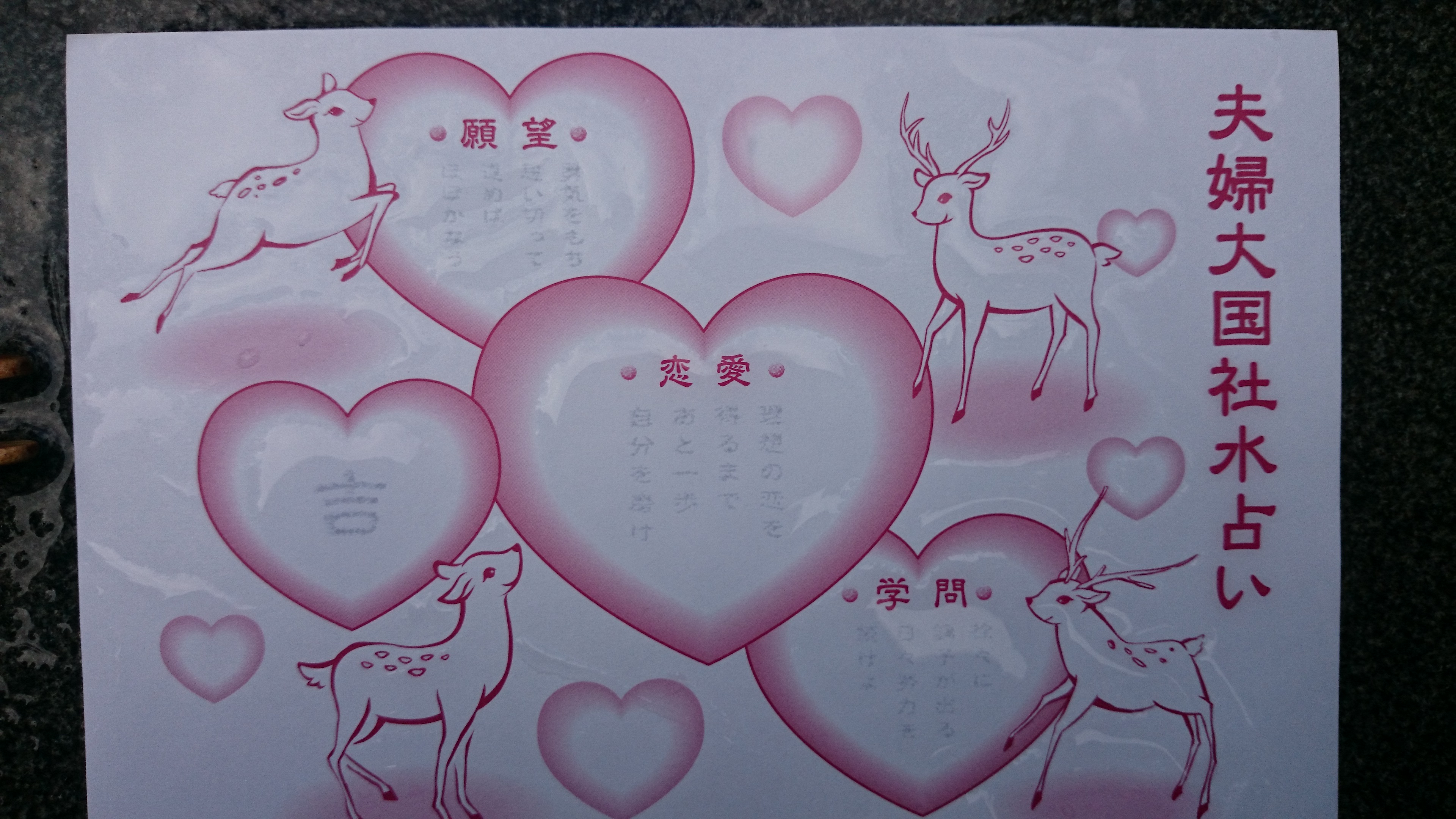 先日、春日大社に行って来ました。初めて水占いをしたのですが、文字が浮きあがるまでドキドキでした(^o^;)